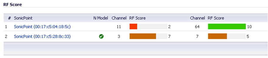 In the SonicOS interface, the RF Score is displayed for the channel that is being used by the SonicPoints.