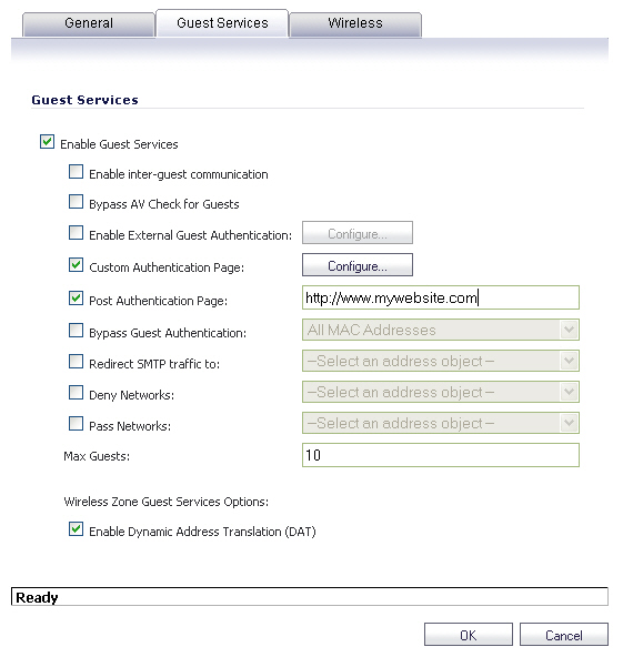 - Guest Services provides spur of the moment “hotspot” access to wireless-capable guests and visitors. For easy connectivity, Guest Services allows wireless users to authenticate and associate, obtain IP settings, and authenticate using any Web-browser. Without DAT, if a guest user is not a DHCP client, but instead has static IP settings incompatible with the Wireless WLAN network settings, network connectivity is prevented until the user’s settings change to compatible values. Dynamic Address Translation (DAT) is a form of Network Address Translation (NAT) that allows the system to support any IP addressing scheme for guest users. For example, the Wireless WLAN interface is configured with its default address of 172.16.31.1, and one guest client has a static IP address of 192.168.0.10 and a default gateway of 192.168.0.1, while another has a static IP address of 10.1.1.10 and a gateway of 10.1.1.1, and DAT enables network communication for both of these clients.