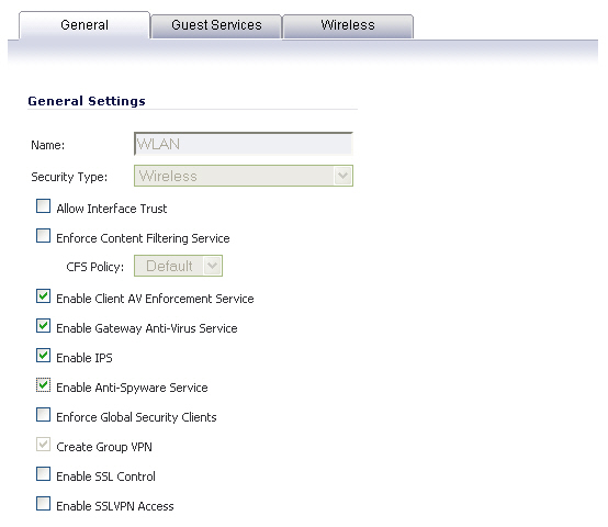 enable SonicWALL Intrusion Prevention Service for incoming and outgoing traffic on the WLAN zone to add more security for internal network traffic. You can enable the following SonicWALL Security Services on zones: