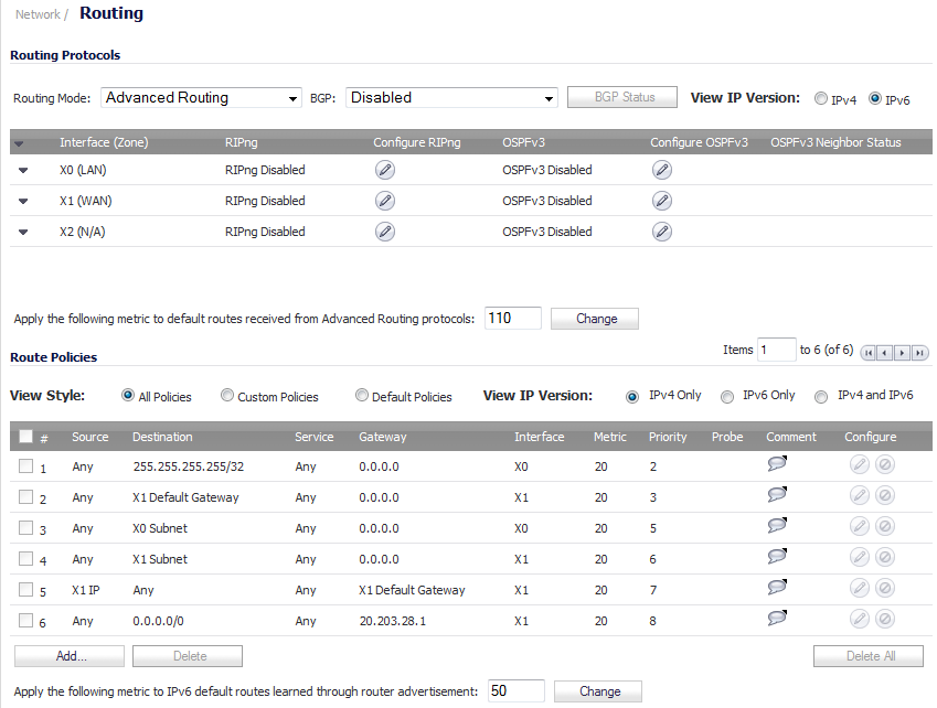 If you have routers on your interfaces, you can configure static routes on the firewall, on the Network > Routing page. You can create static routing policies that create static routing entries that make decisions based upon source address, source netmask, destination address, destination netmask, service, interface, gateway and metric. This feature allows for full control of forwarding based upon a large number of user-defined variables.