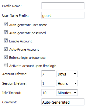 To allow guest accounts generated from this profile to have an automatically generated user name, select the Auto-generate user name checkbox. The user name is usually the prefix plus a two- or three-digit number. By default, this feature is enabled. I