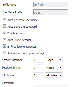 To allow all guest accounts generated from this profile to be enabled upon creation, select the Enable Account checkbox. By default, this feature is enabled. I
