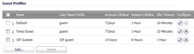 The Guest Profiles table shows the profiles you have created and enables you to add, edit, and delete profiles.