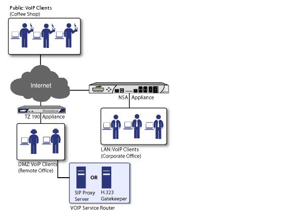 For VoIP clients that register with a server on the DMZ or LAN, the SonicWALL security appliance automatically manages NAT policies and access rules. The SonicWALL security appliance performs stateful monitoring of registration and permits incoming calls for clients while they remain registered. No configuration on the VoIP clients is required.