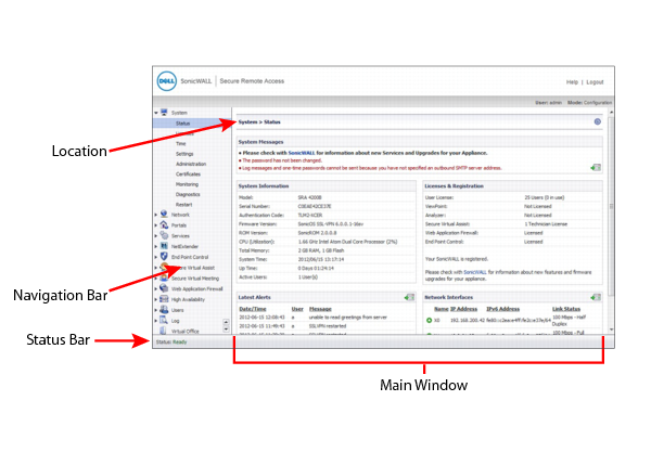 The Status bar at the bottom of the management interface window displays the status of actions executed in the SRA management interface.
