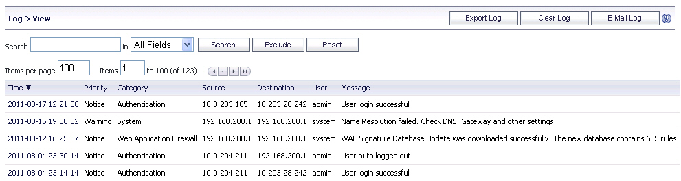 Navigating tables with large number of entries is simplified by navigation buttons located above the table. For example, the Log > View page contains an elaborate bank of navigation buttons: