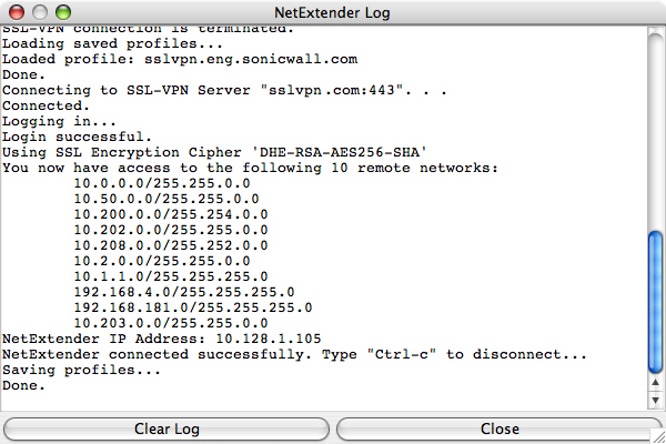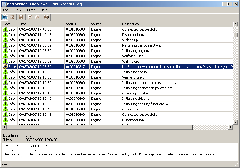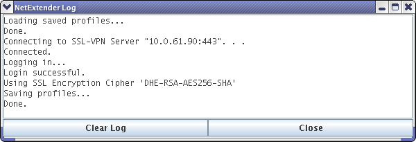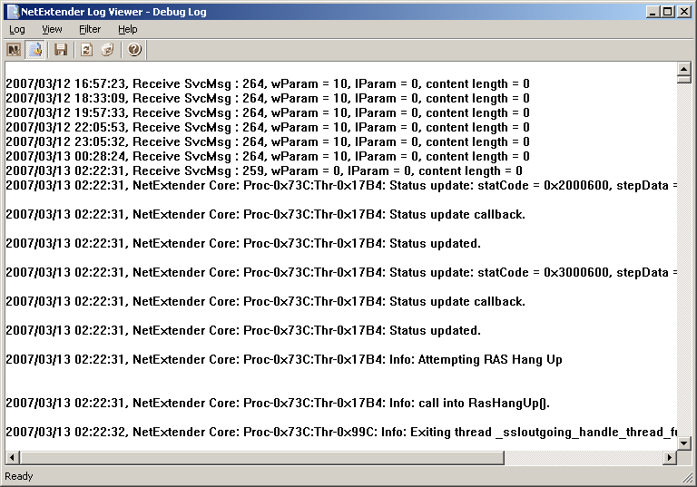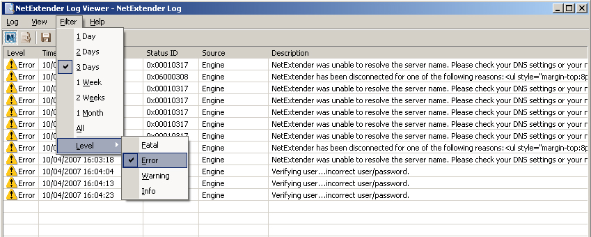 5 Click the Internet Explorer proxy settings button to open Internet Explorer’s proxy settings.The NetExtender log displays information on NetExtender session events. The log is a file named NetExtender.dbg. It is stored in the directory: C:\Program Files\SonicWALL\SSL VPN\NetExtender. To view the NetExtender log, right click on the NetExtender icon in the system tray, and click View Log.To view details of a log message, double-click on a log entry, or go to View > Log Detail to open the Log Detail pane.To filter the log to display entries from a specific duration of time, go to the Filter menu and select the cutoff threshold.To filter the log by type of entry, go to Filter > Level and select one of the level categories. The available options are Fatal, Error, Warning, and Info, in descending order of severity. The log displays all entries that match or exceed the severity level. For example, when selecting the Error level, the log displays all Error and Fatal entries, but not Warning or Info entries.