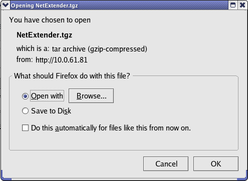 2 Click the NetExtender button. A pop-up window indicates that you have chosen to open the NetExtender.tgz file. Click OK to save it to your default download directory.