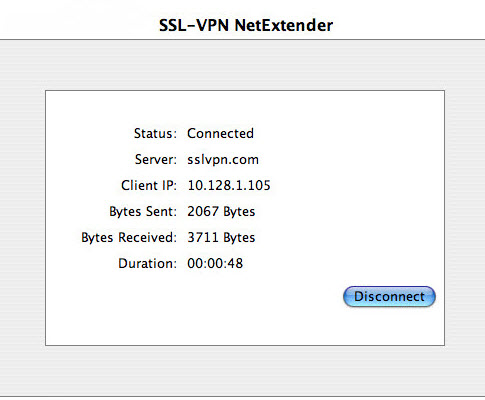 8 When NetExtender completes installing, the NetExtender Status window displays, indicating that NetExtender successfully connected.