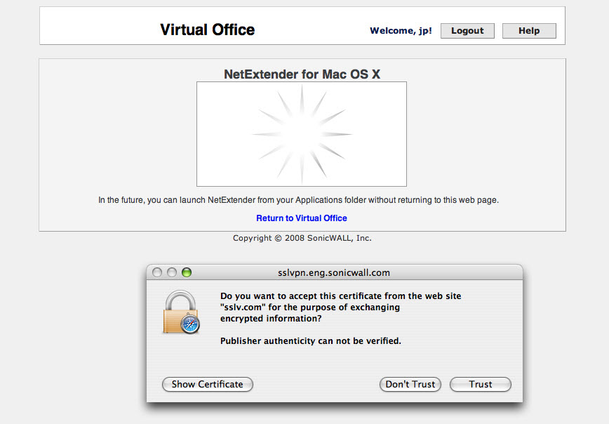 10 Return to the SSL VPN portal and click on the NetExtender button. The portal will automatically install the NetExtender stand-alone application on your computer. The NetExtender installer window opens.