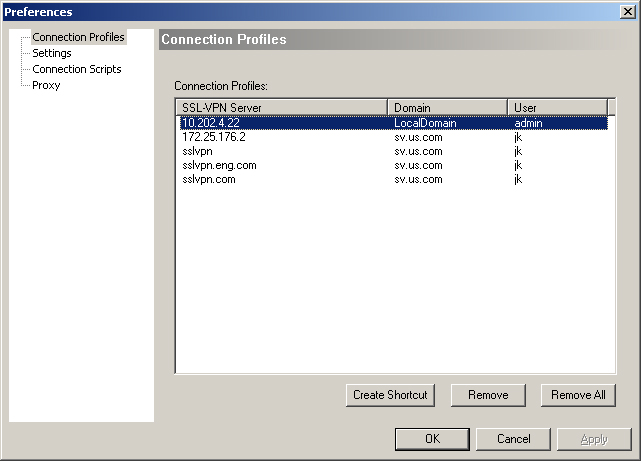 2 The Connection Profiles tab displays the SSL VPN connection profiles you have used, including the IP address of the server, the domain, and the username.