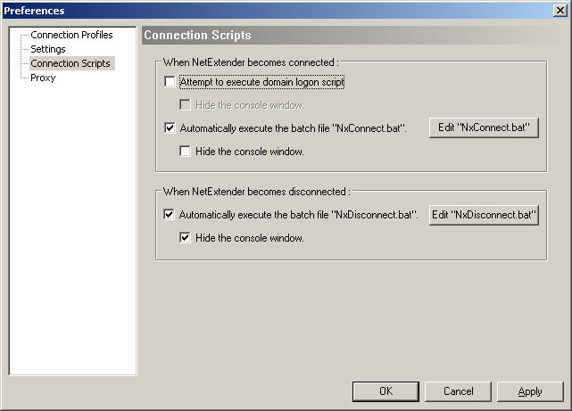 7 Click Apply.NetExtender Connection Scripts can support any valid batch file commands. For more information on batch files, see the following Wikipedia entry: http://en.wikipedia.org/wiki/.bat. The following tasks provide an introduction to some commonly used batch file commands.