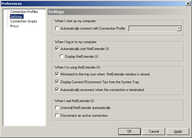1 Right click on the iconin the system tray and click on Preferences... The NetExtender Preferences window is displayed.