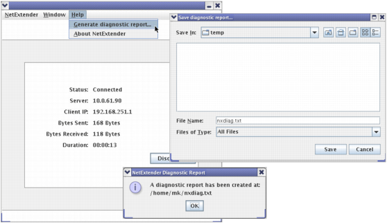 13 Click Save to save the diagnostic report using the default nxdiag.txt file name in your NetExtender directory.