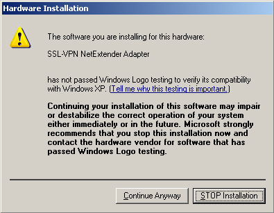 12 If a warning message that NetExtender has not passed Windows Logo testing is displayed, click Continue Anyway. SonicWALL testing has verified that NetExtender is fully compatible with Windows Vista, XP, 2000, and 2003 and later.