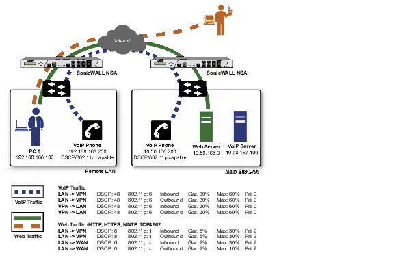 In our above scenario, the firewall at the Main Site assigns a DSCP tag (e.g. value 48 ) to the VoIP packets, as well as to the encapsulating ESP packets, allowing layer 3 QoS to be applied across the WAN. This assignment can occur either by preserving the existing DSCP tag, or by mapping the value from an 802.1p tag, if present. When the VoIP packets arrive at the other side of the link, the mapping process is reversed by the receiving SonicWALL, mapping the DSCP tag back to an 802.1p tag.