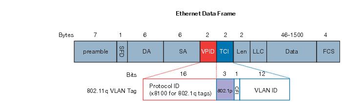 • TPID : Tag Protocol Identifier begins at byte 12 (after the 6 byte destination and source fields), is 2 bytes long, and has an Ethertype of 0x8100 for tagged traffic.