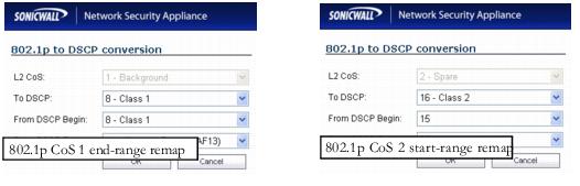 SonicOS Enhanced on SonicWALL NSA series appliances has the ability to recognize, map, modify, and generate the industry-standard external CoS designators, DSCP and 802.1p (refer to the “802.1p and DSCP QoS” section ).