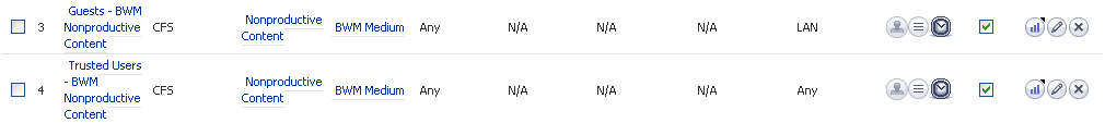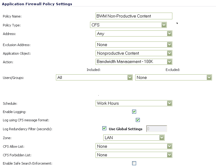 dropdown list, select ‘Bandwidth Management - 100k’ to apply this custom BWM rule when users attempt to access non-productive content.