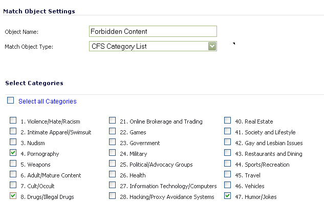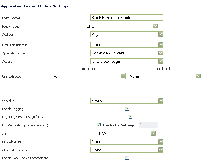 dropdown list, select ‘CFS block page’ to display a pre-formatted ‘blocked content’ page when users attempt to access forbidden content.