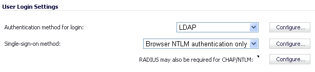 • Select Browser NTLM authentication only if you want to authenticate Web users without using the SSO Agent or TSA. Users are identified as soon as they send HTTP traffic. NTLM requires RADIUS to be configured (in addition to LDAP, if using LDAP), for access to MSCHAP authentication. If LDAP is selected above, a separate Configure button for RADIUS appears here when NTLM is selected.
