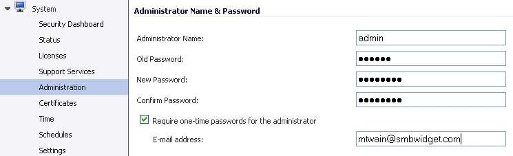 To use the one-time password, the appliance must have access to a correctly configured SMTP server. If OTP is enabled for administrators, without access to a correctly configured SMTP server, all users needing an OTP will not be able to log in. In this case, an administrator would need to log in through the command line console to disable their own OTP, by entering the following commands in the serial console (assumes SonicWALL NSA 3500 appliance):