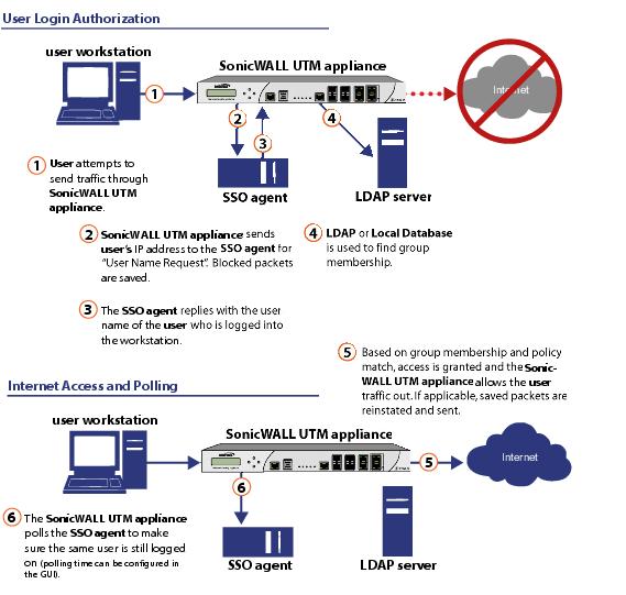 The SonicWALL SSO authentication process is initiated when user traffic passes through a SonicWALL security appliance, for example, when a user accesses the Internet. The sent packets are temporarily blocked and saved while the SonicWALL security appliance sends a “User Name” request and workstation IP address to the authorization agent running the SSO Agent (the SSO workstation).