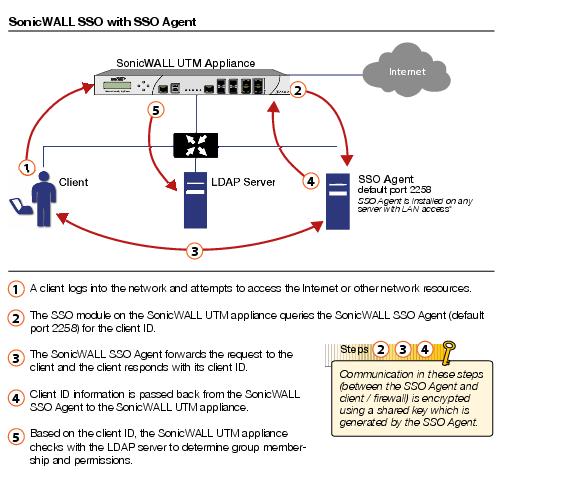 The SonicWALL SSO Agent only communicates with clients and the SonicWALL security appliance. SonicWALL SSO Agent uses a shared key for encryption of messages between the SSO Agent and the SonicWALL security appliance.